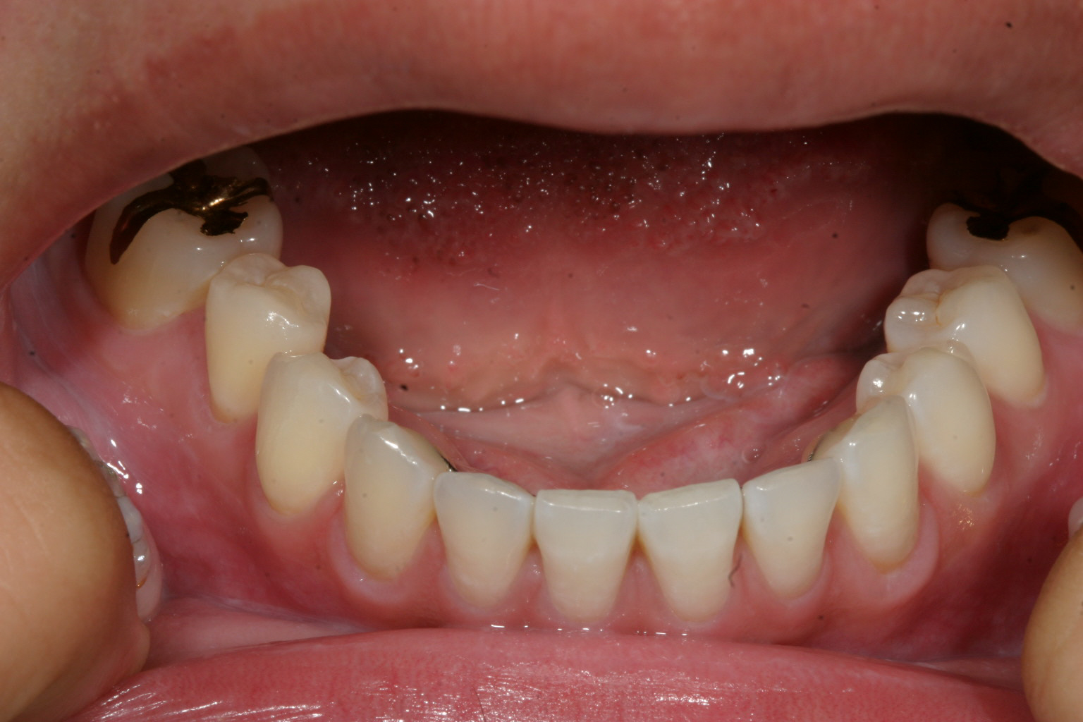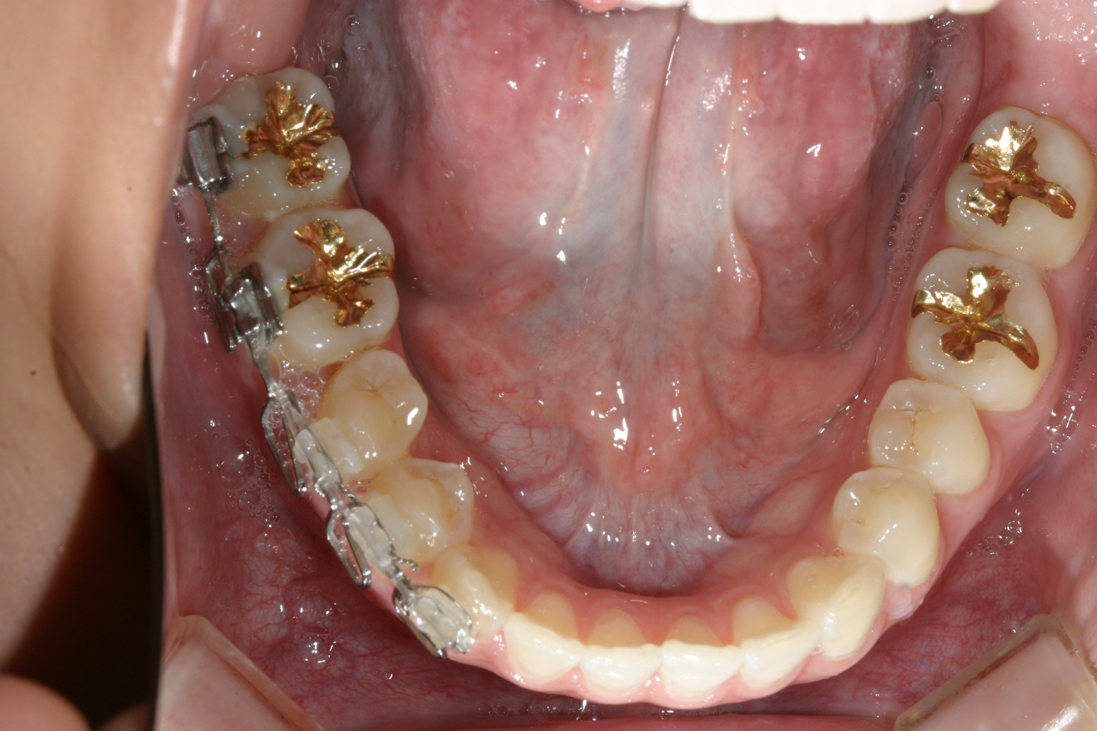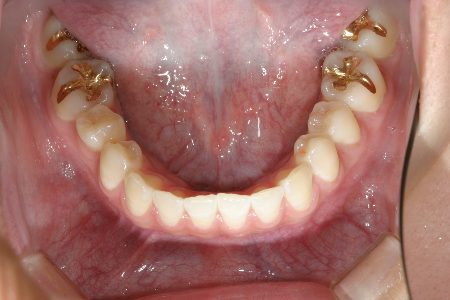 下顎は一見綺麗に見えるのですが右の奥から3本目を見てください。 歯が90°回転しているのが見受けられます。 こういった歯をインビザライン単独で治療するにはかなり難易度が高く治療に相当の期間がかかり 結果として上手く戻らない事が多いです。 その為今回は部分ワイヤーを併用しました。