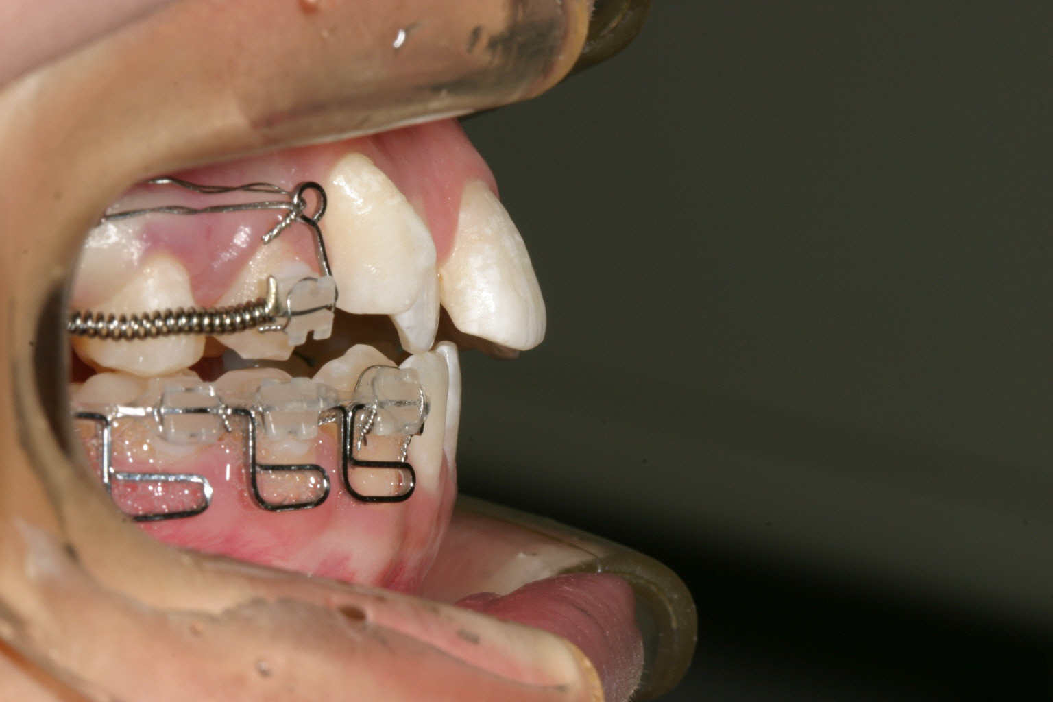 右の犬歯の突出が気になりますね~ 口の中を見ると単に糸切り歯が出てるだけなんだから入れればいいと簡単に考えるのですが 犬歯が並ばないのは奥歯が全体的に前に来ている為に犬歯の入るスペースが無く外に飛び出しているんです。 その為部分ワイヤーを用いて犬歯以後の臼歯を全体的に遠心移動(後ろに送る事)しました。