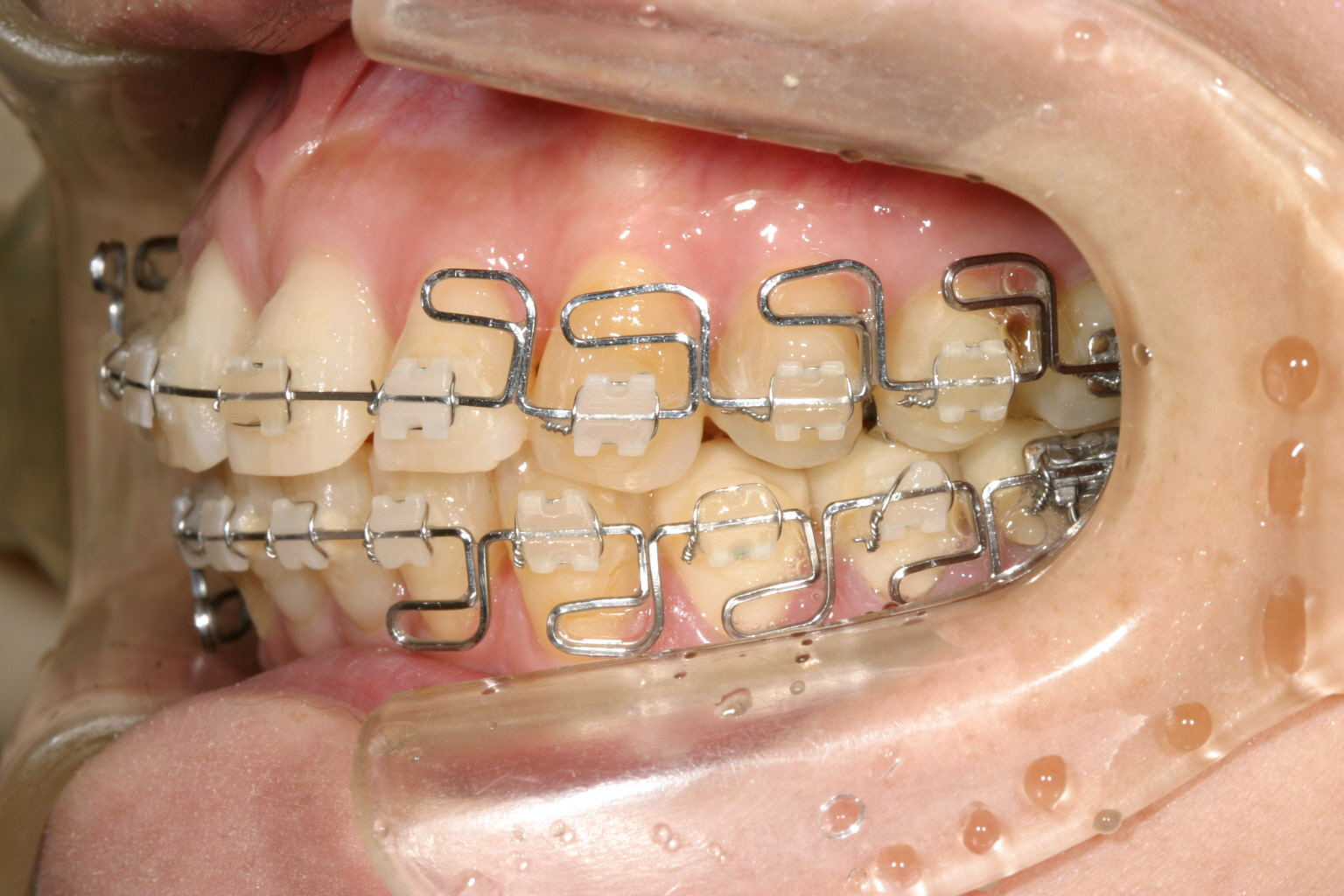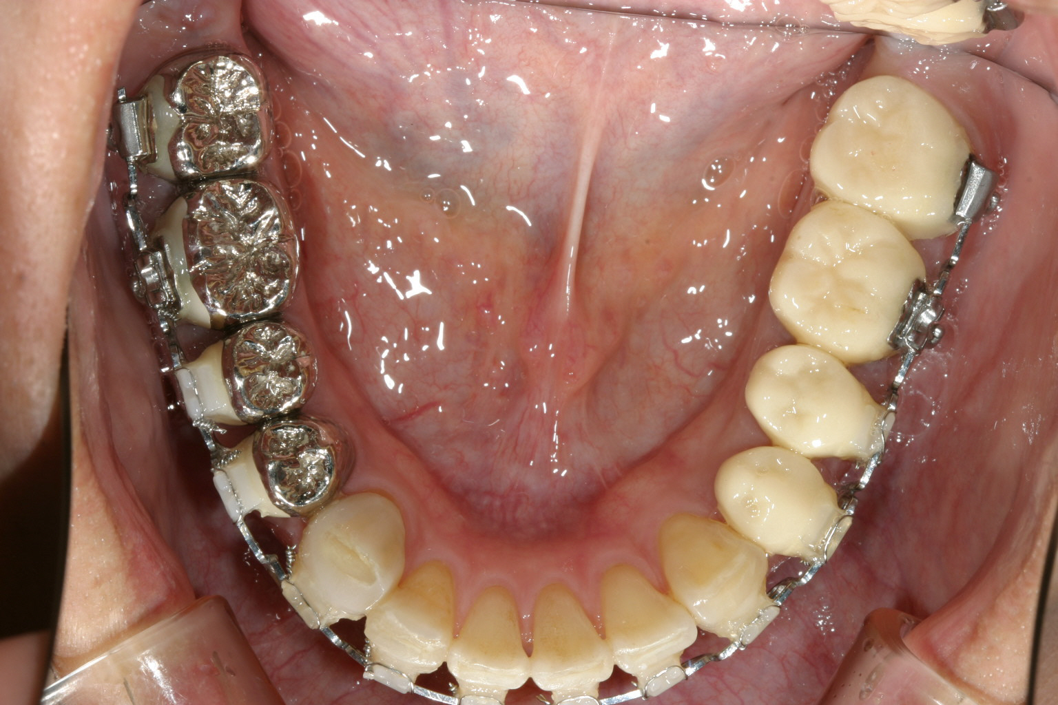 下顎は8本の臼歯を仮歯に変更して顎位を修正したのちマルチループワイヤーにてかみ合わせの調整を行う。 最初右にも左と同様のプラスティックレジン冠を入れるが顎位が右に戻る傾向があり咬耗激しく現在の様な金属冠に変更する。(全体的に少し高さを挙げて特に右側を沢山挙げる事により顎位が左へシフトさせる) アーチフォームもU字変更している。