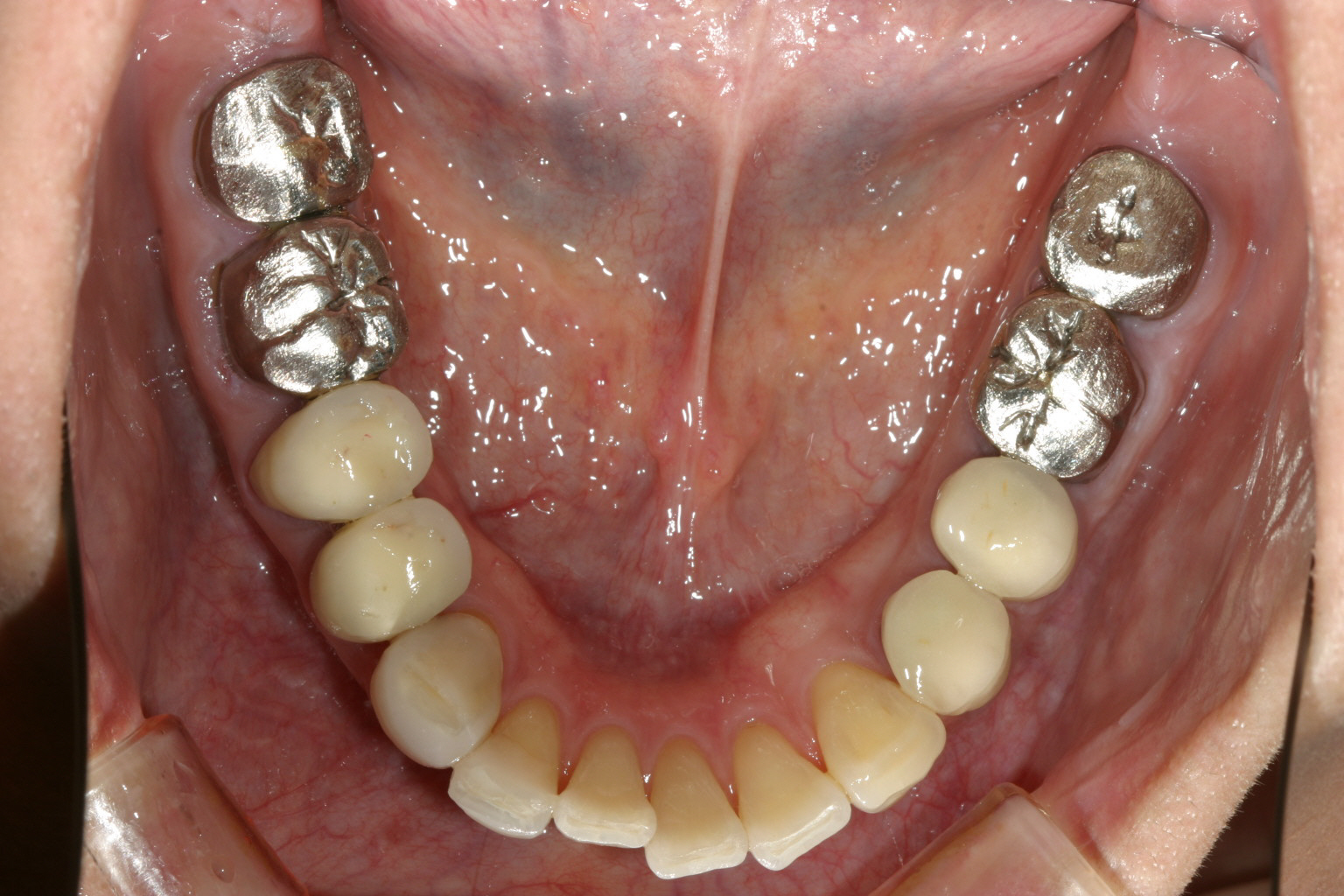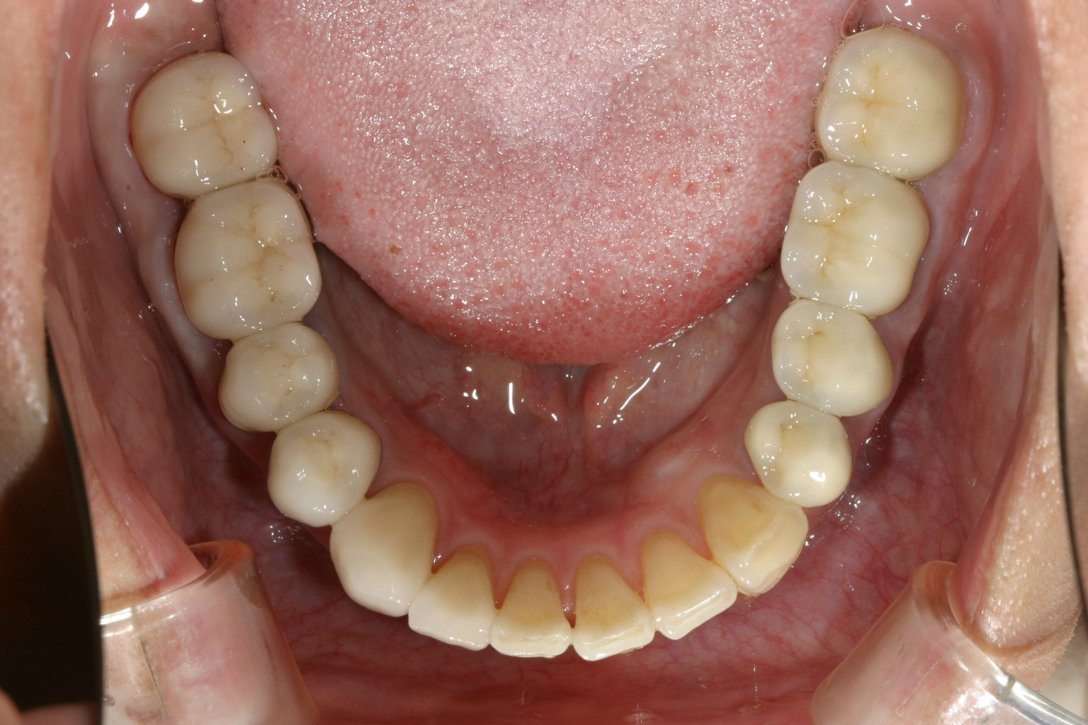 下顎も矯正による咬合修正も終わり左右臼歯にジルコニア冠で8本補綴完了する