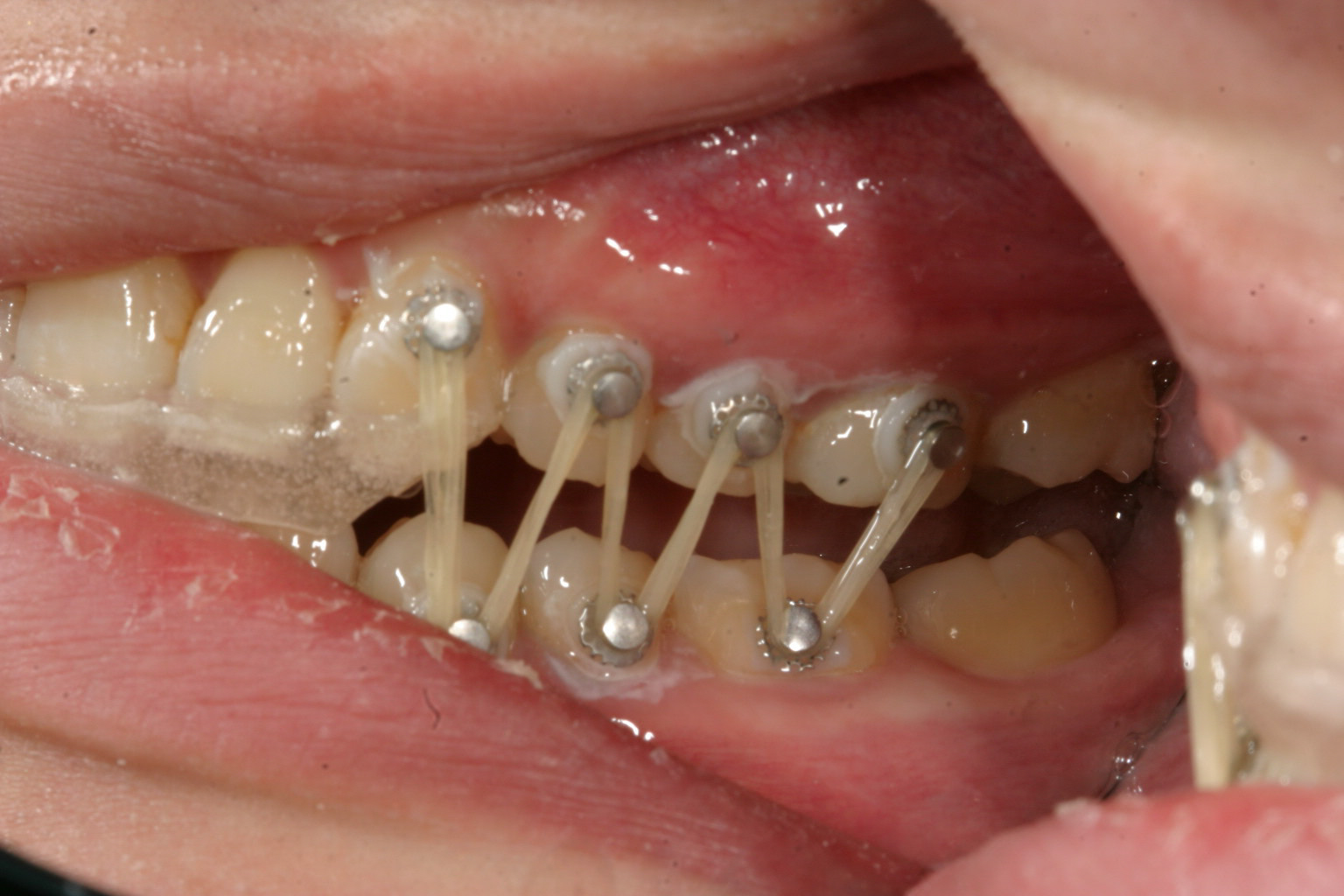 前歯部に自家製のジグ咬ませて右側にアップダウンエラスティックを使用してます。