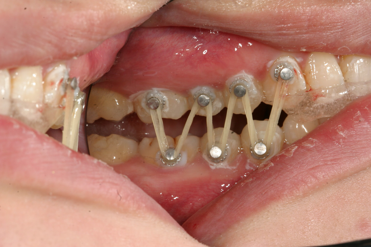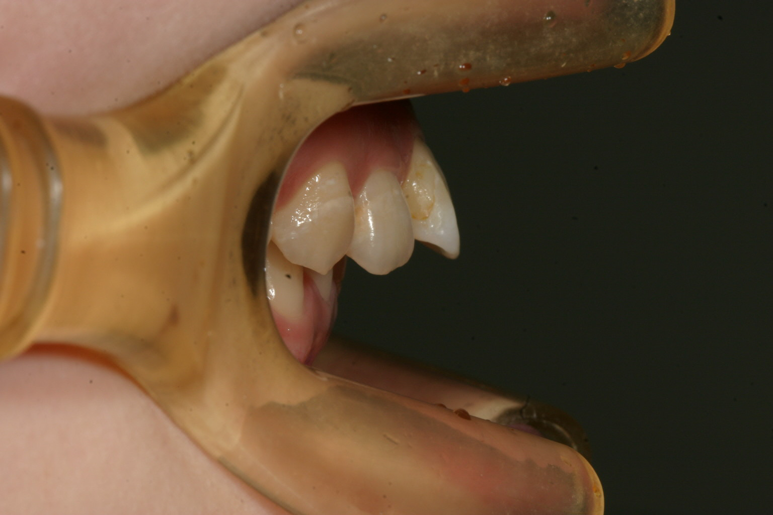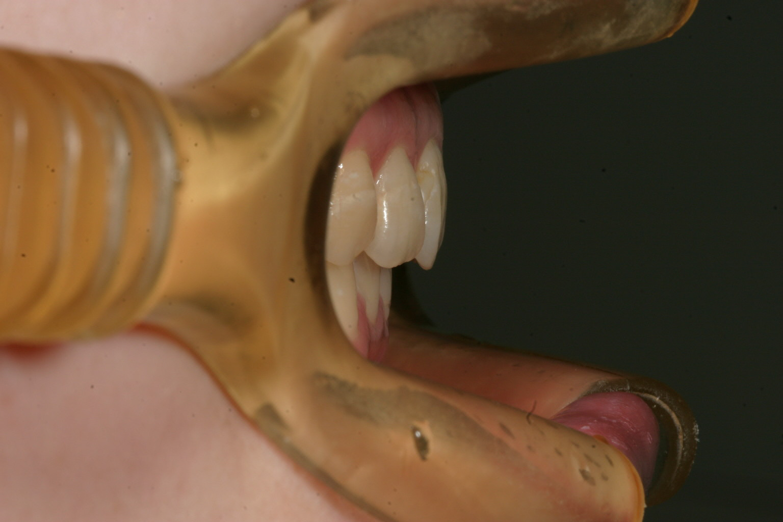 このケースは臼歯部の歯が低い為に下顎が後ろに下がり、出っ歯 すきっ歯を生じています。この様な症例には顎関節症が付き物です。