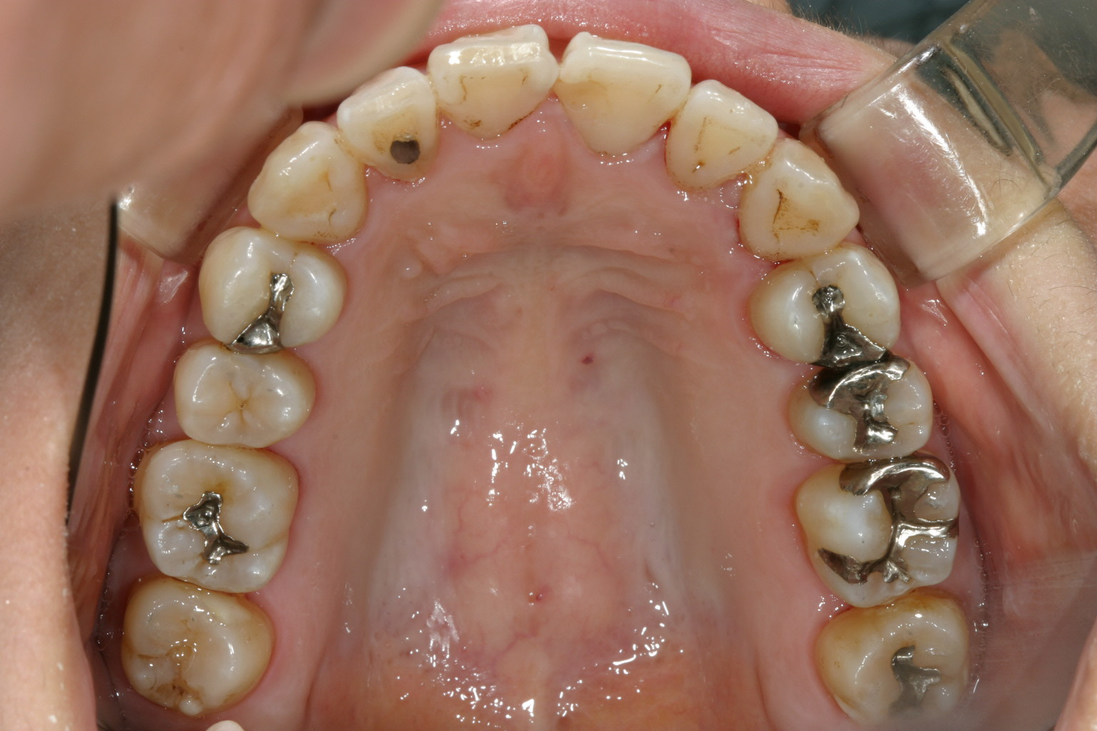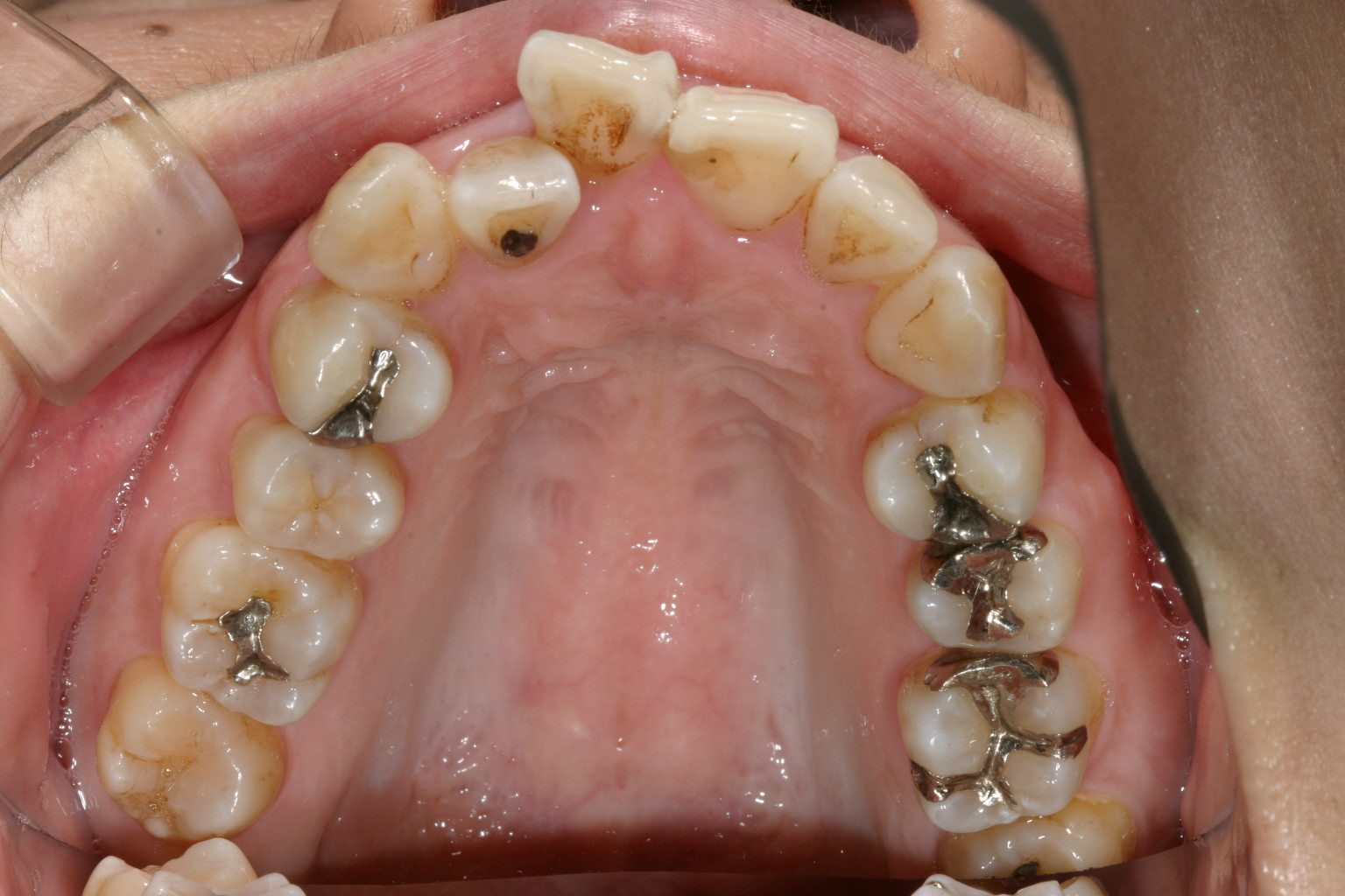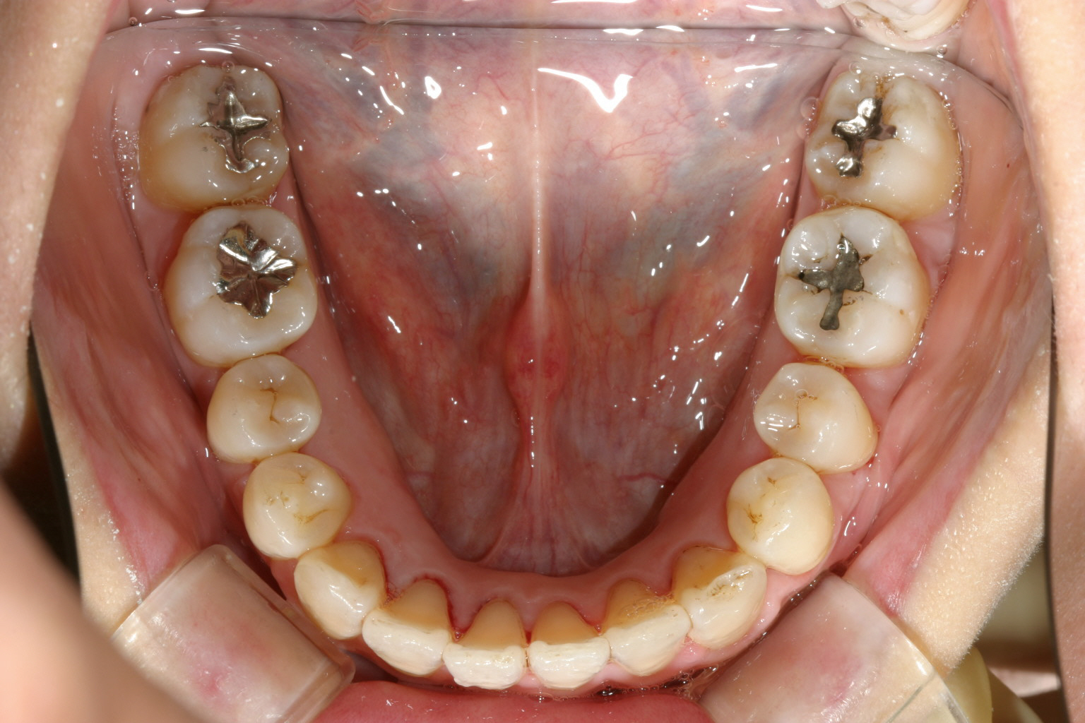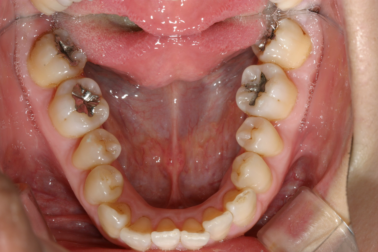 アーチの形状がV字になっている為、犬歯と犬歯の間が狭く前歯がガタガタになっています。