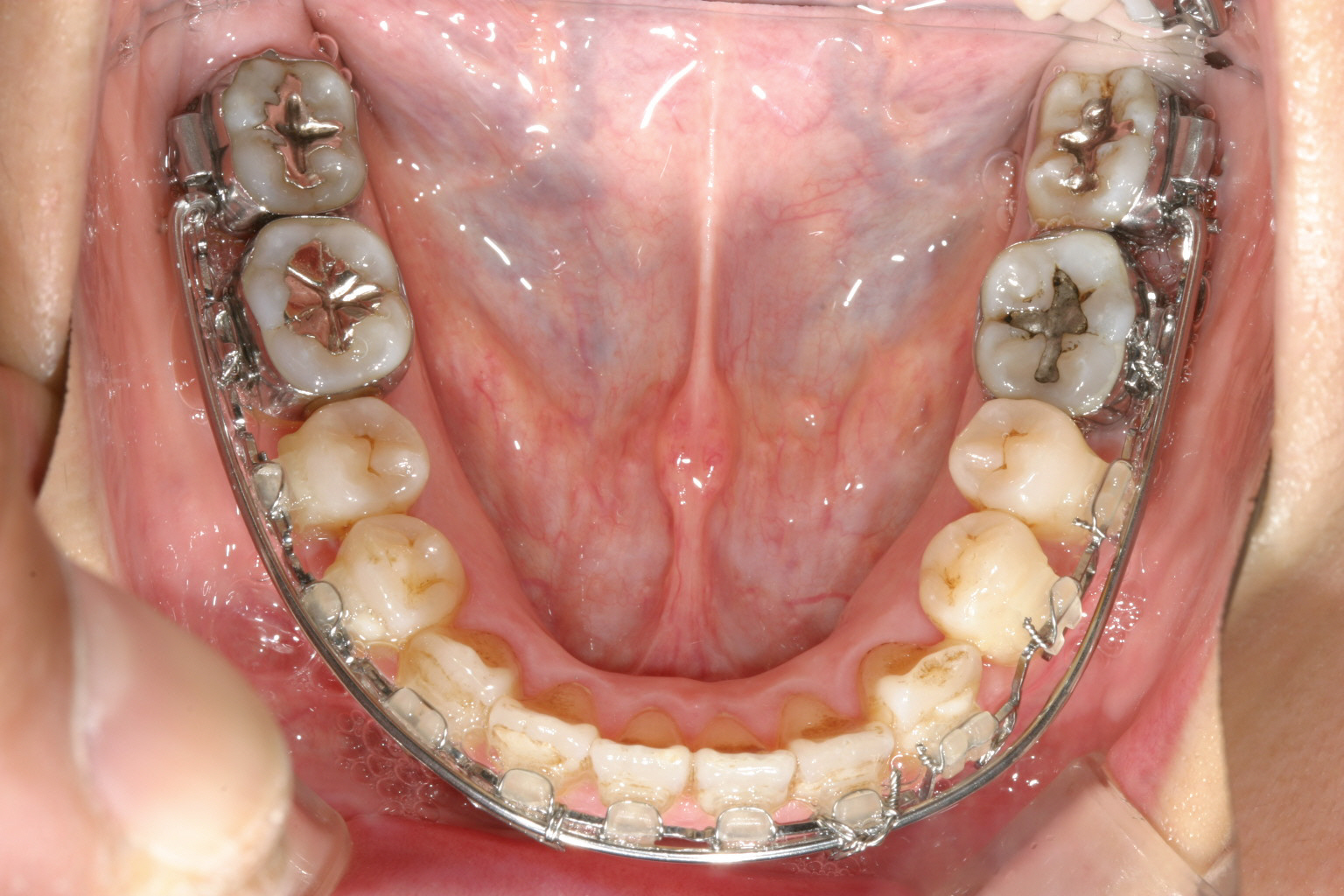 下顎もマルチループの外側に太いマリガンワイヤーが入っています、この太いワイヤーのお陰で内方に倒れていた臼歯が立ってきました。