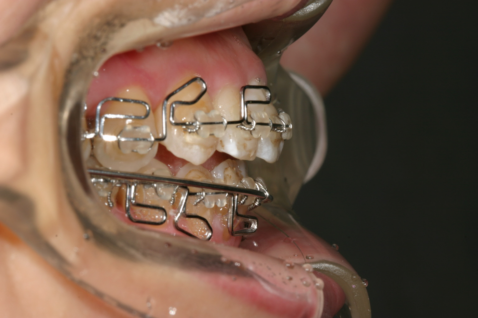 これが横から見た上顎のマルチループワイヤーと下顎のマルチループワイヤーとマリガンワイヤーです。 上顎の前突も殆ど改善しています。