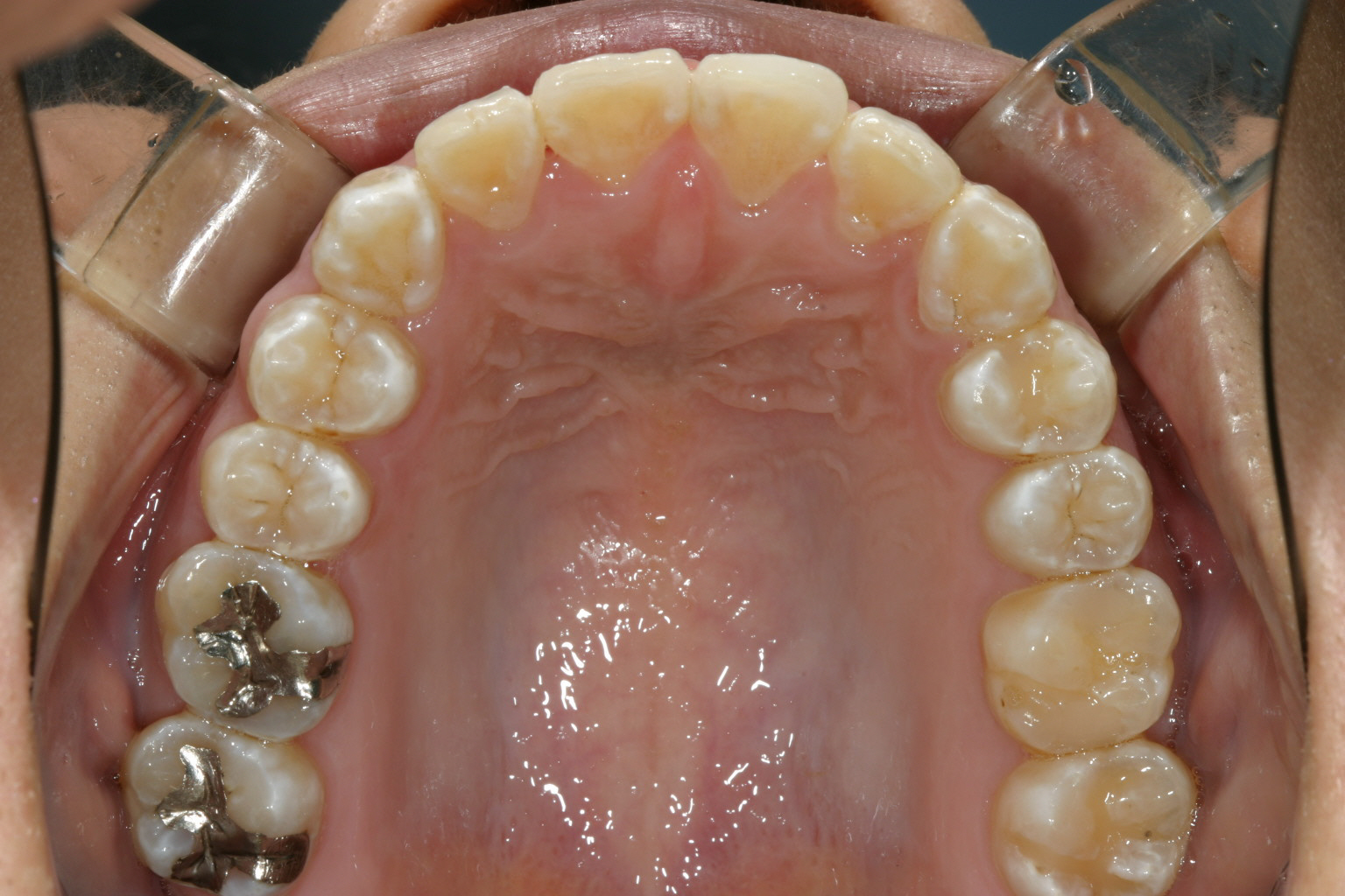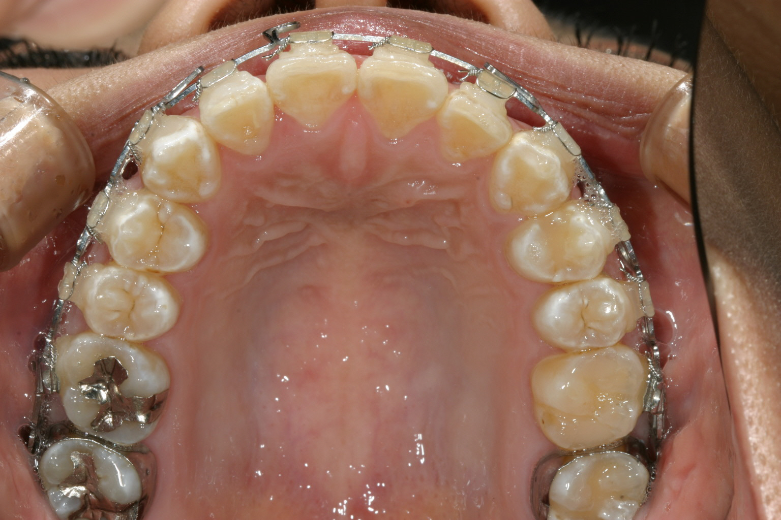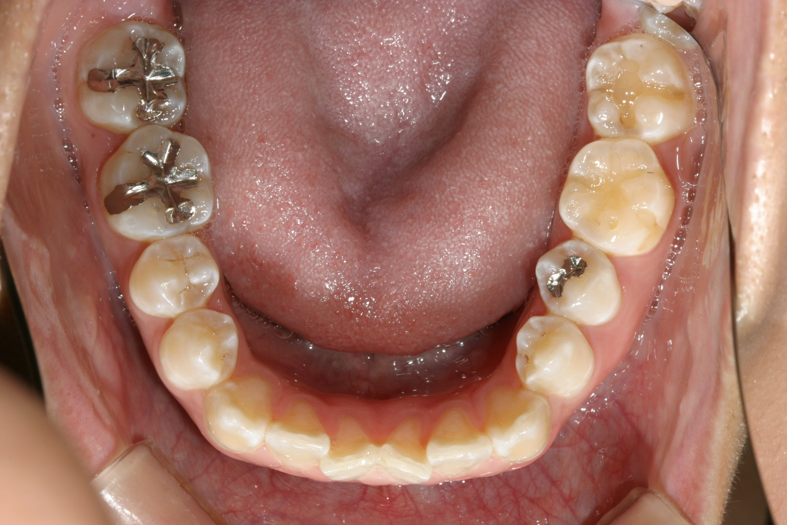 この患者さんは知り合いの方でどんな方法を使ってでもとにかく早く終わりたいと言う希望が有りましたので見栄えは悪いのは承知でマルチループワイヤー矯正を選択致しました。