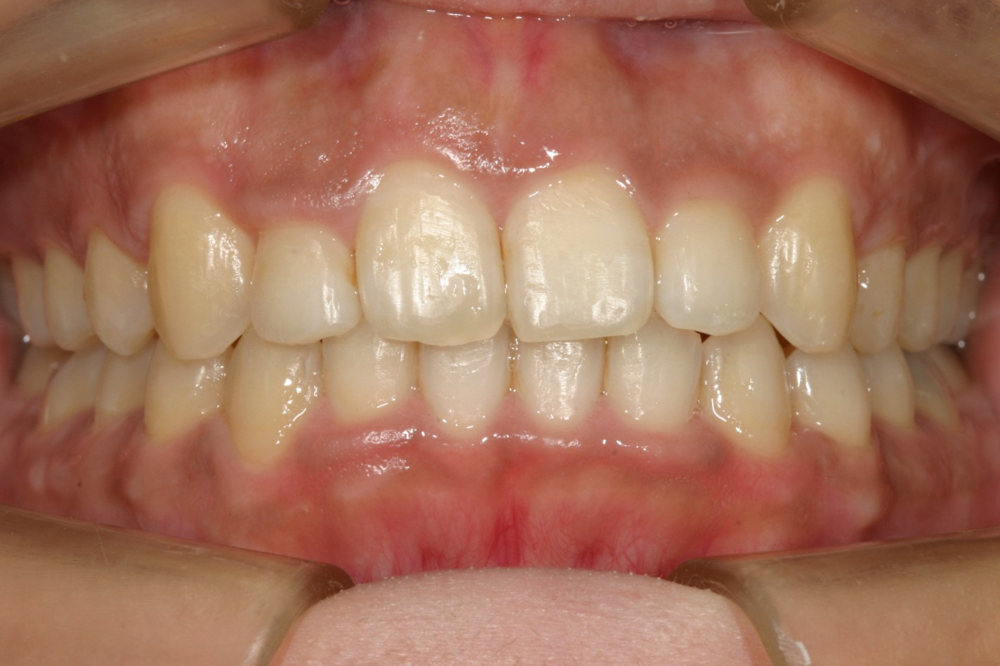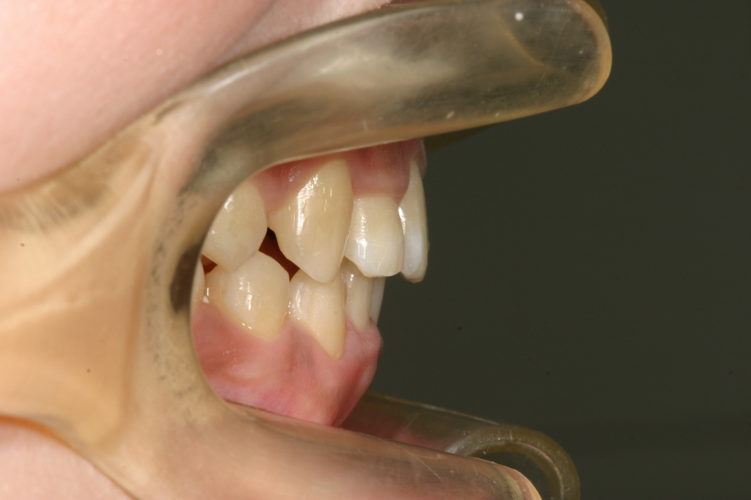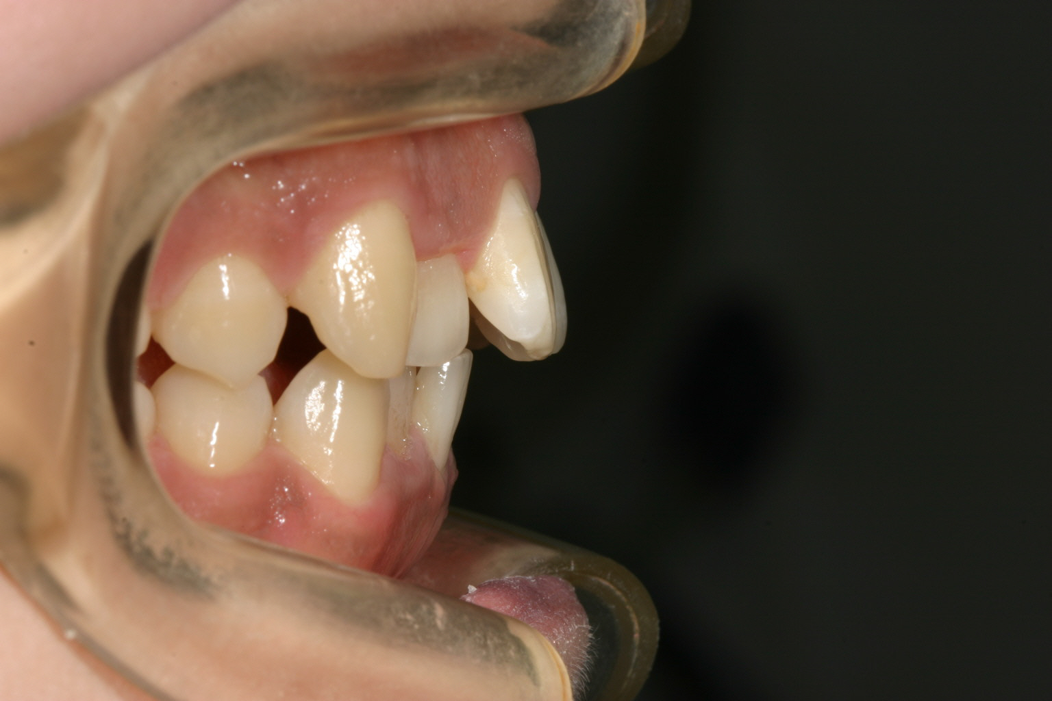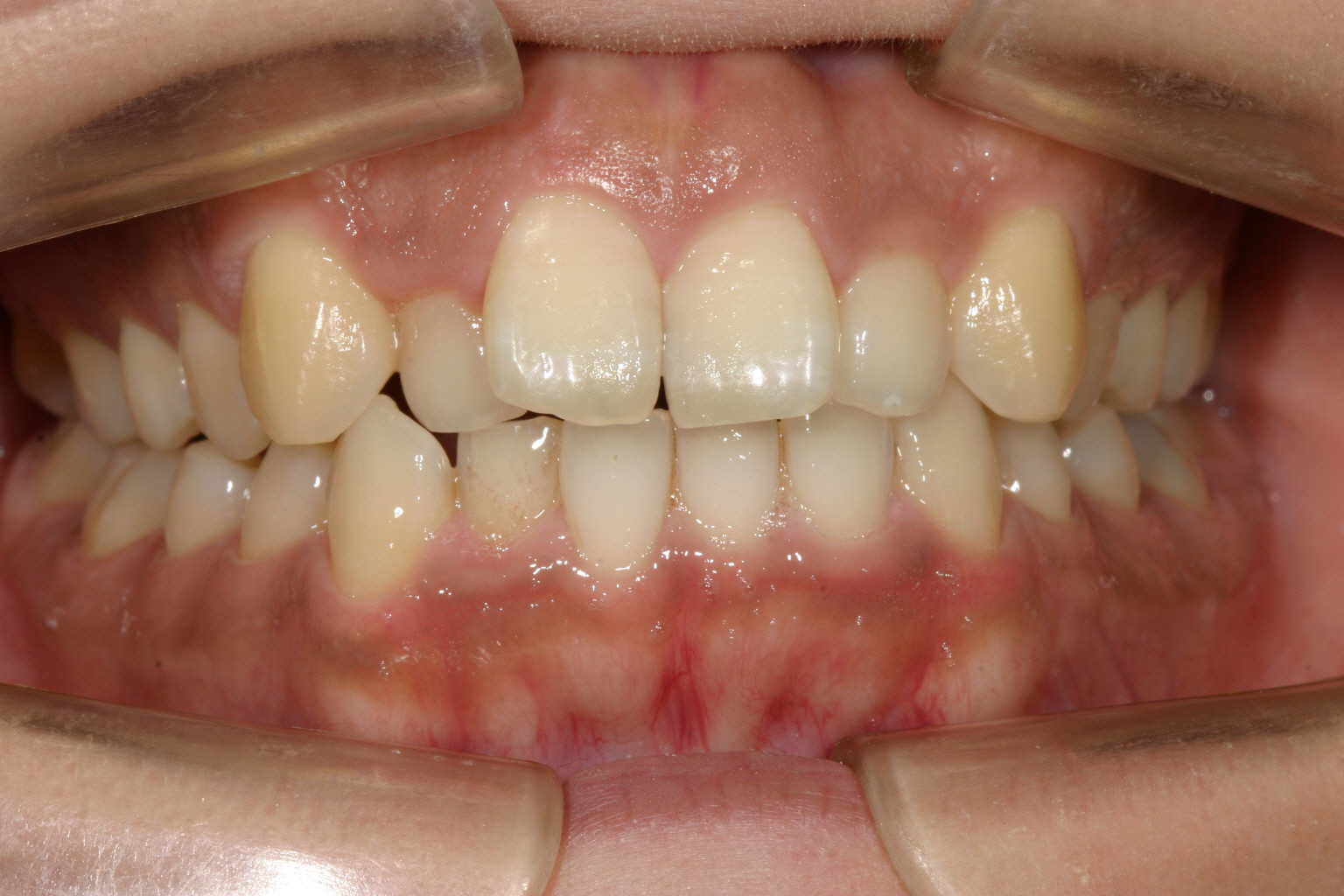 前歯が飛び出して少し翼状捻転しています。