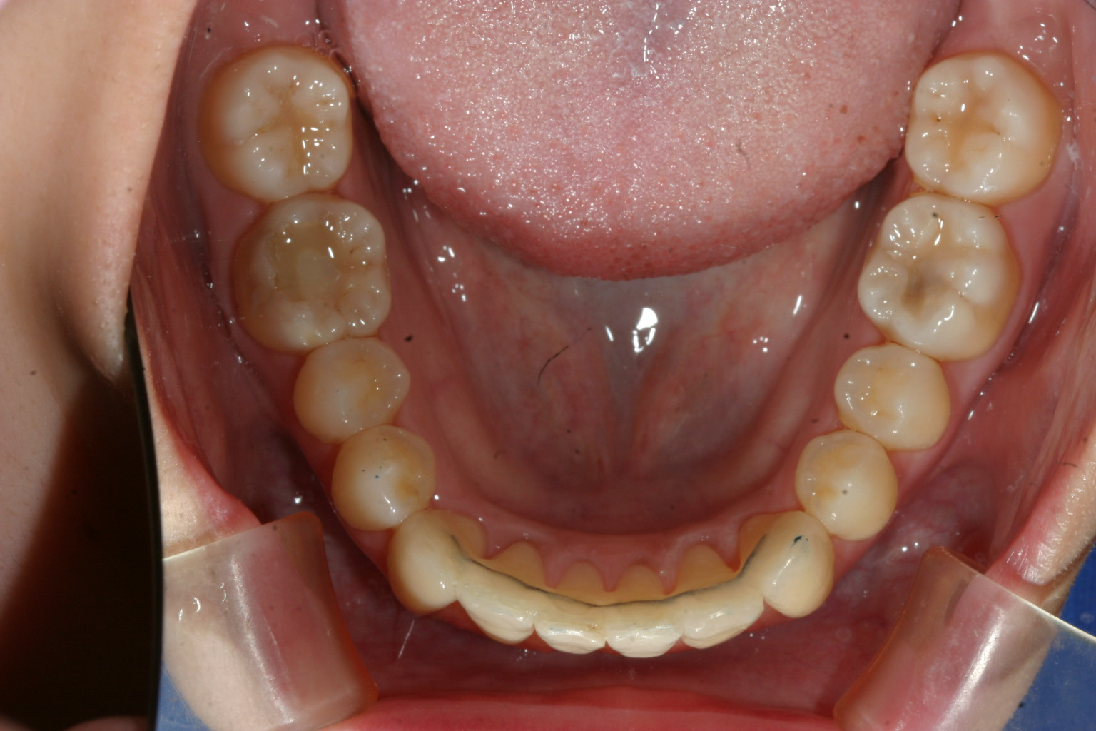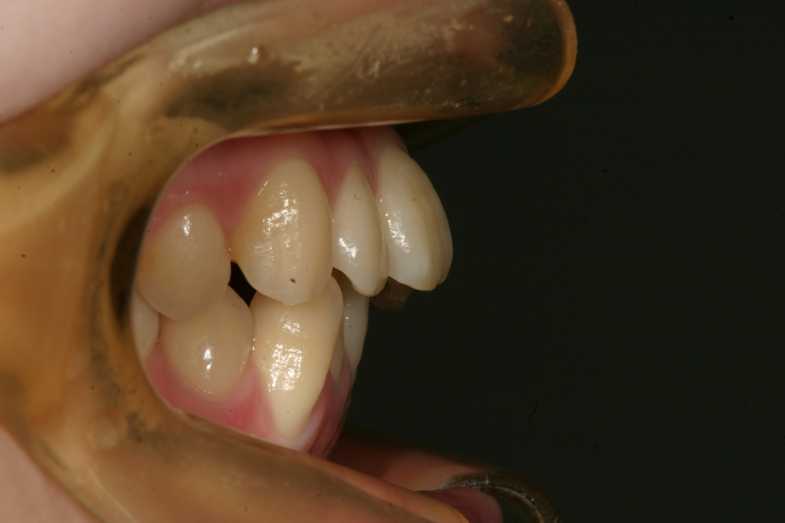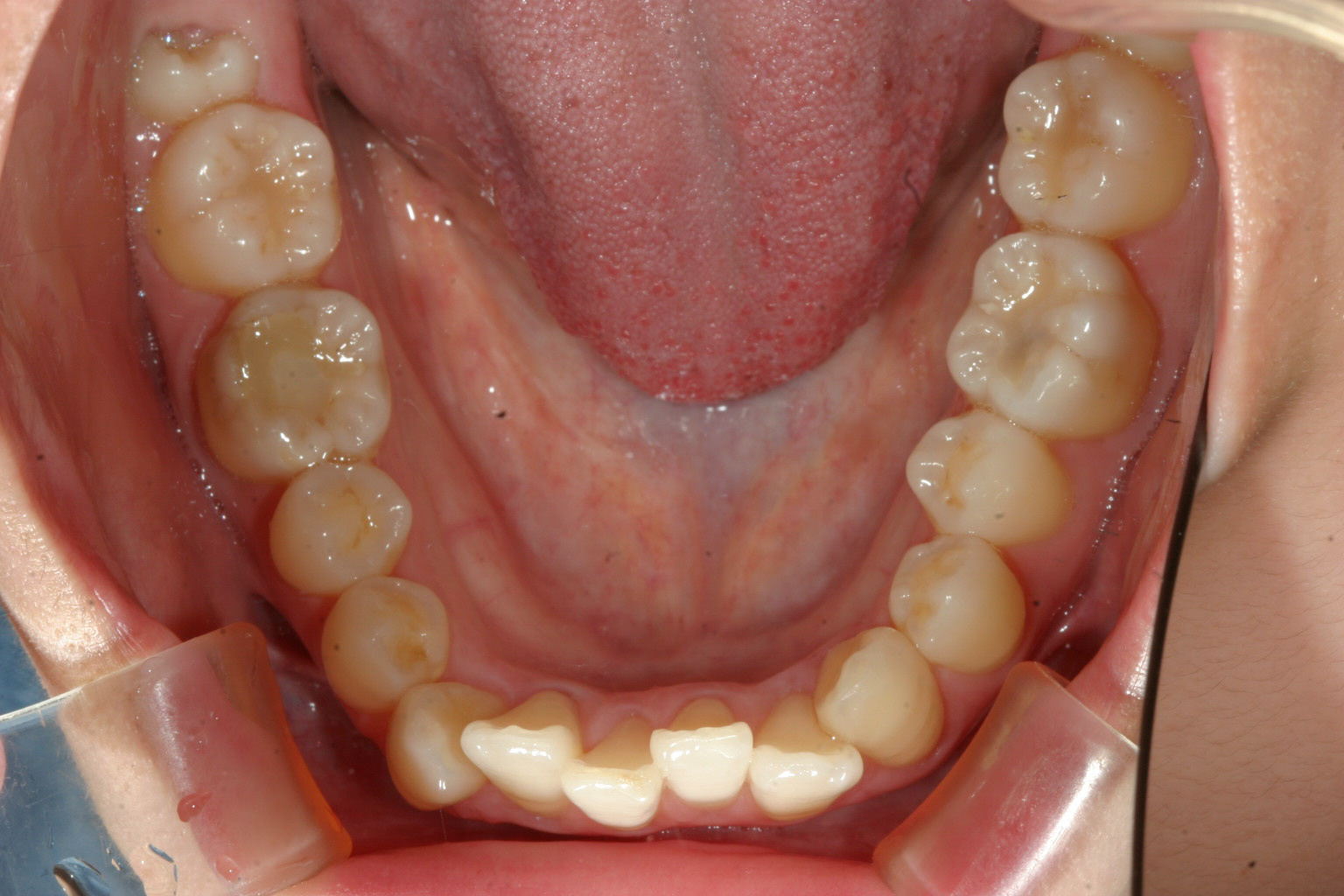 下の前歯は歯列がV字形の為4本の前歯が上手く並ばずガタガタになってます。