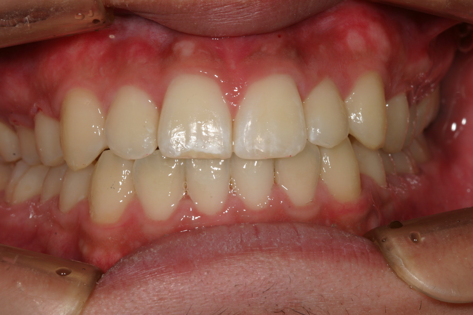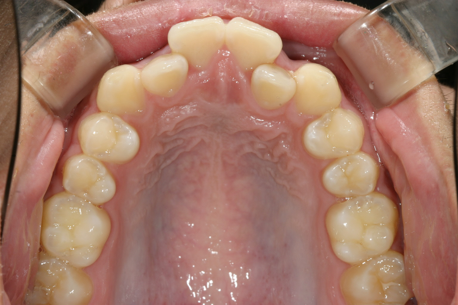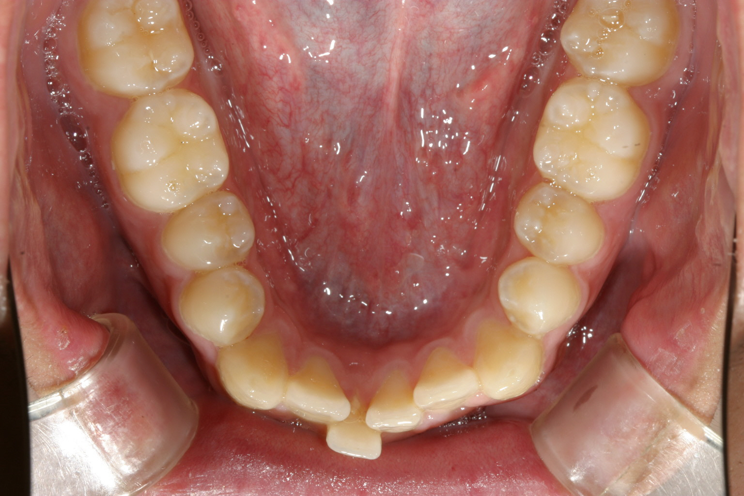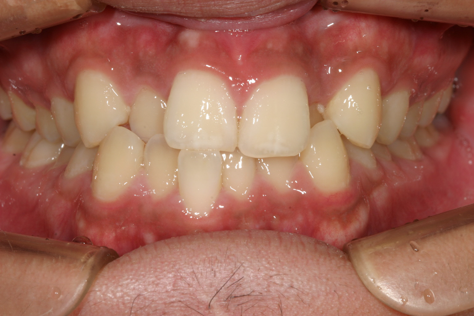 当院ではよくあるケースで犬歯間が狭くなっている為上手く前歯が並んでいません。