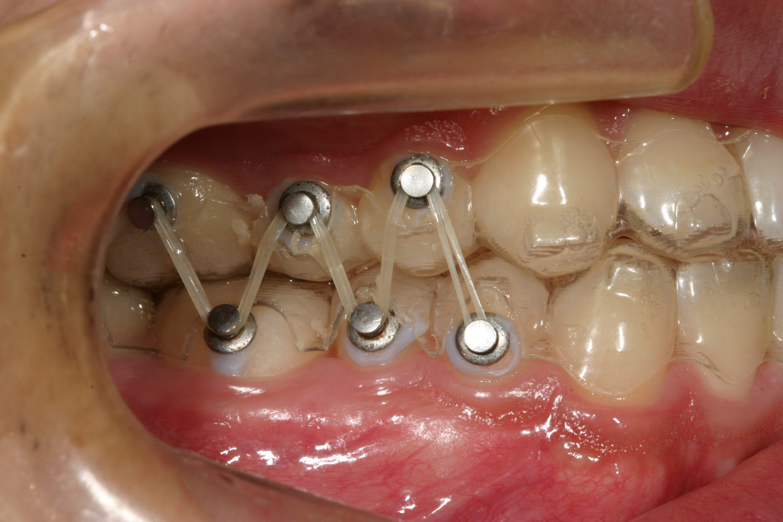 最終的に咬み合わせが少し甘いと感じた時はこの様なアップダウンエラスティックを使用致します。こうする事によりかみ合わせが緊密になります。