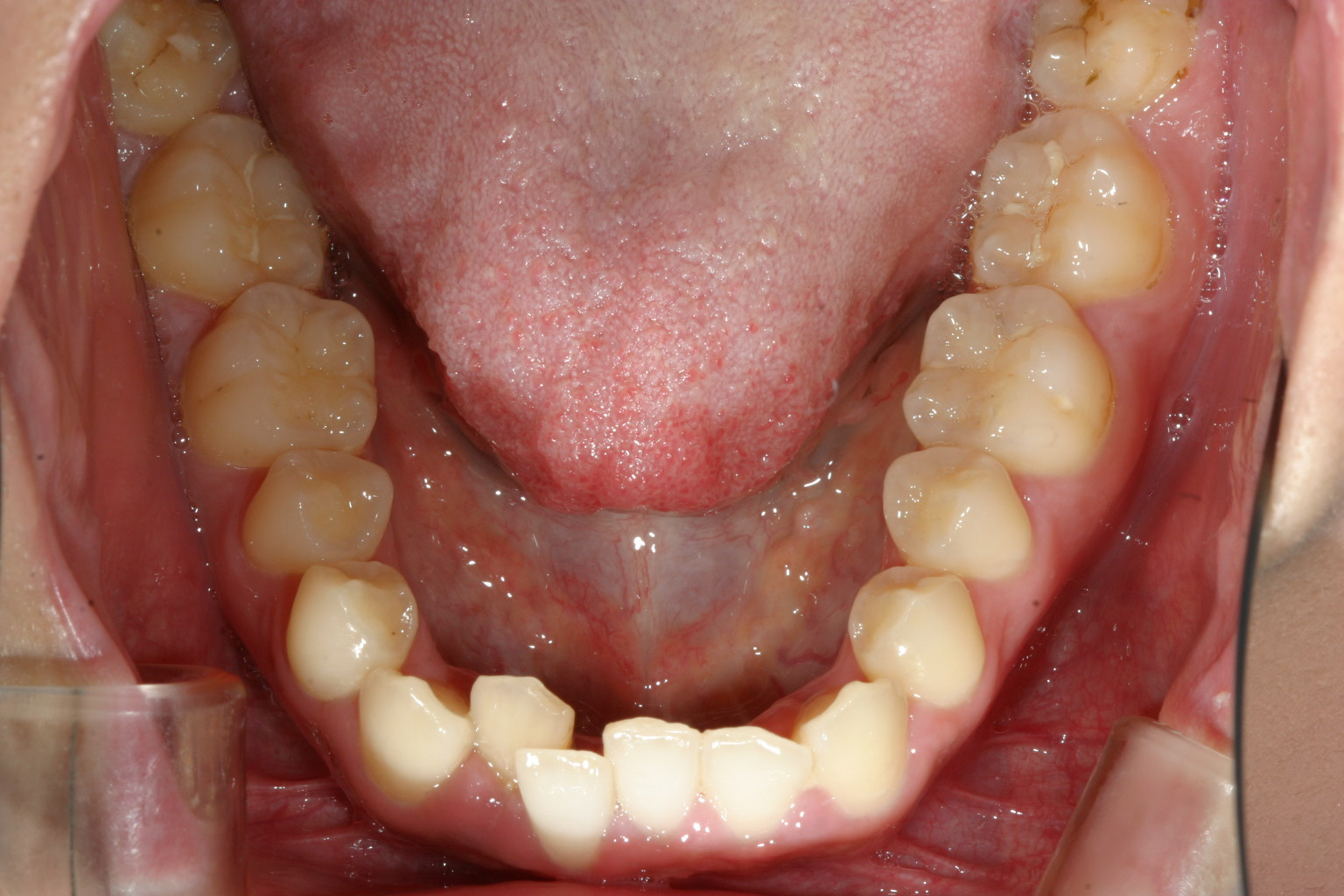 下顎もアーチが狭くV字型をしていて叢生が目立ちます。