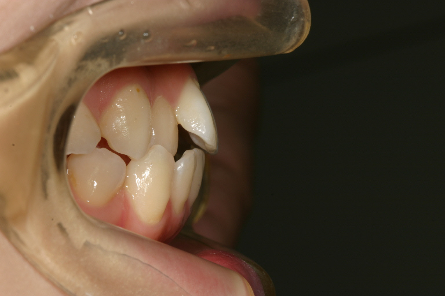 側面観は前歯が少しガタガタしている関係上出っ張って見えます。
