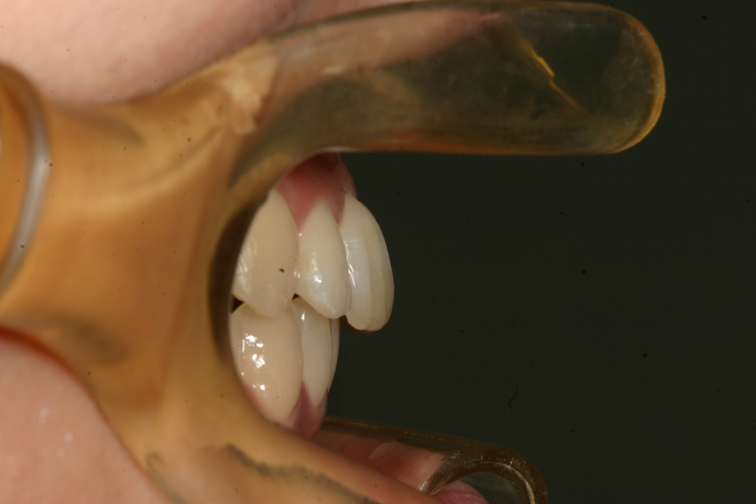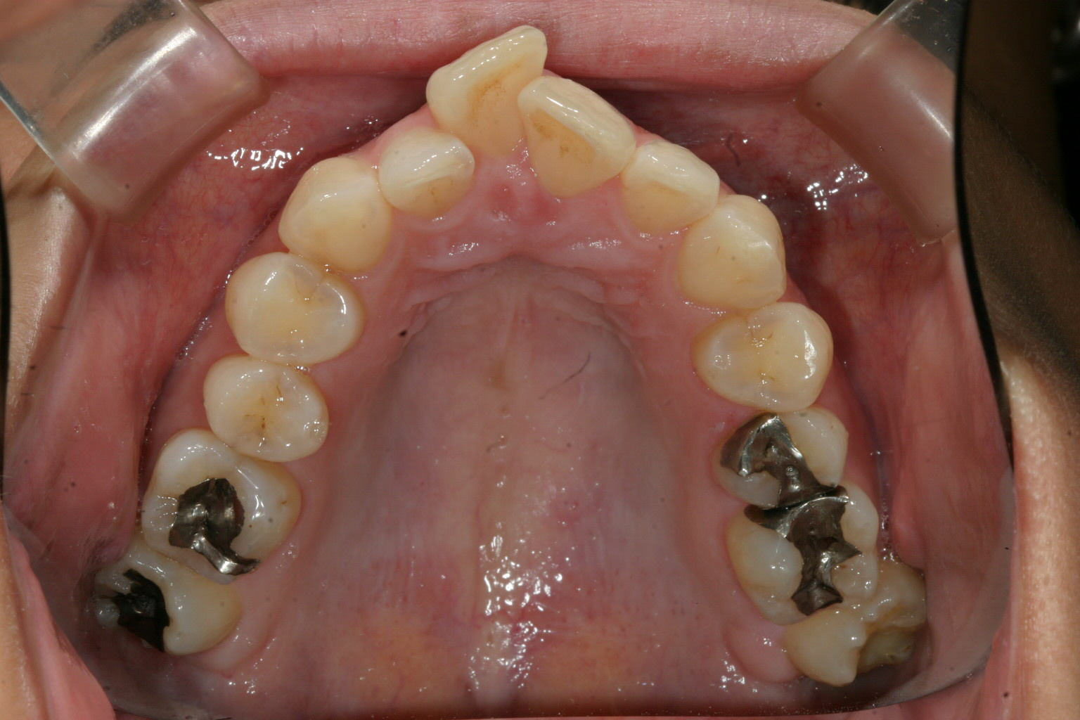 完全に歯列が尖っています。 両側犬歯の幅が狭い為にアーチがV字型になっています。