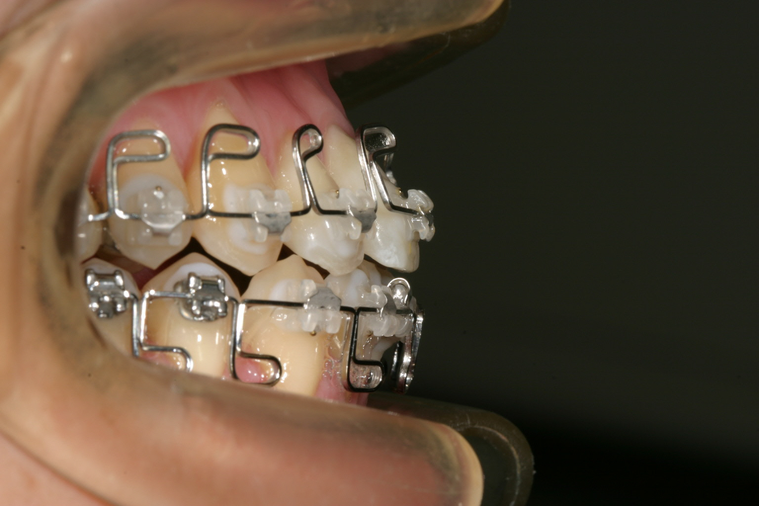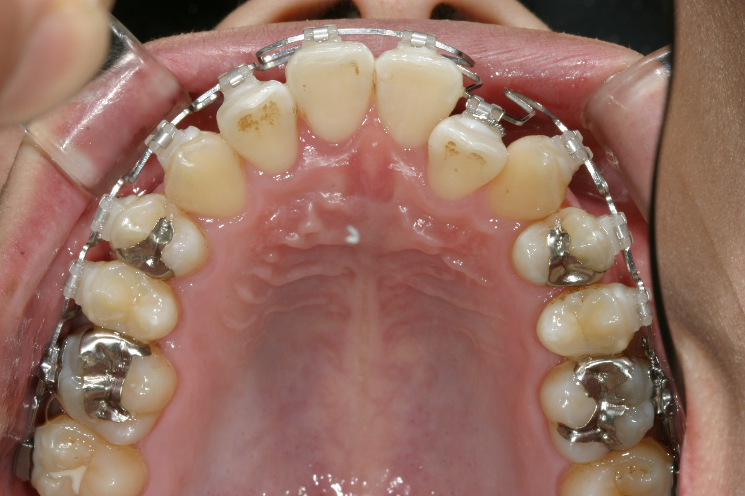 見かけは悪く、違和感も大きいですがメリットはガタガタしていても最初からワイヤ~がブラケットに結紮出来る為、一度結紮できれば24時間仕事してくれるため時間をかなり短縮できる事にあります。