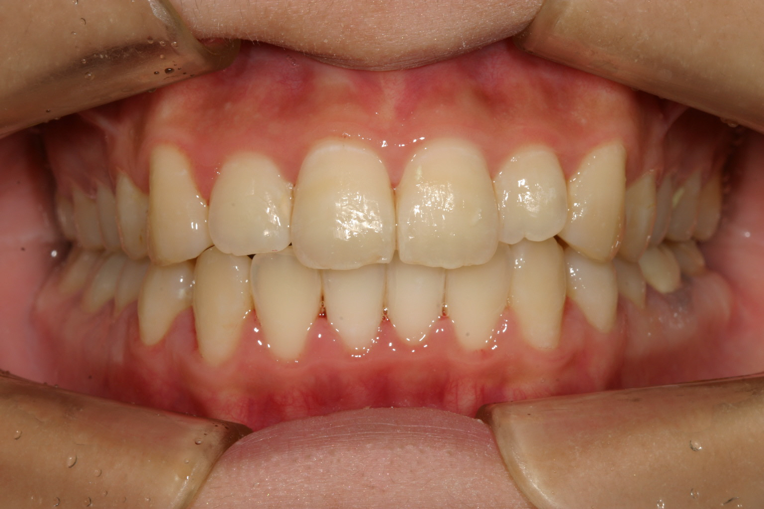 下顎もアーチが狭い為その付けが前歯にきて叢生になっています。