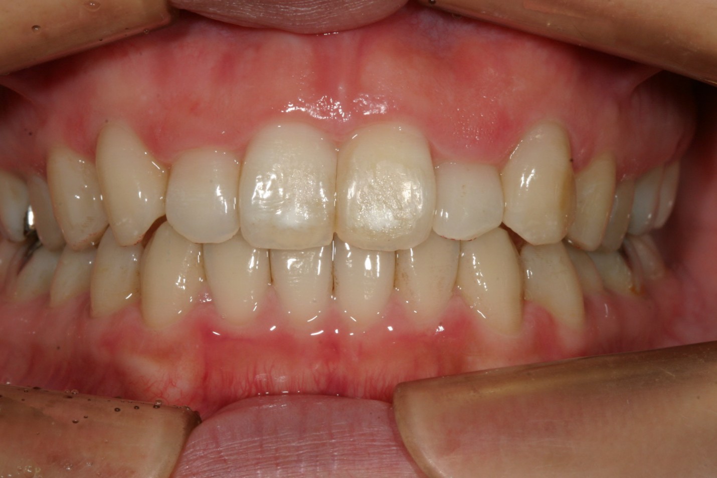 前歯の歪みと片前歯の下への出っ張りが気になる。
